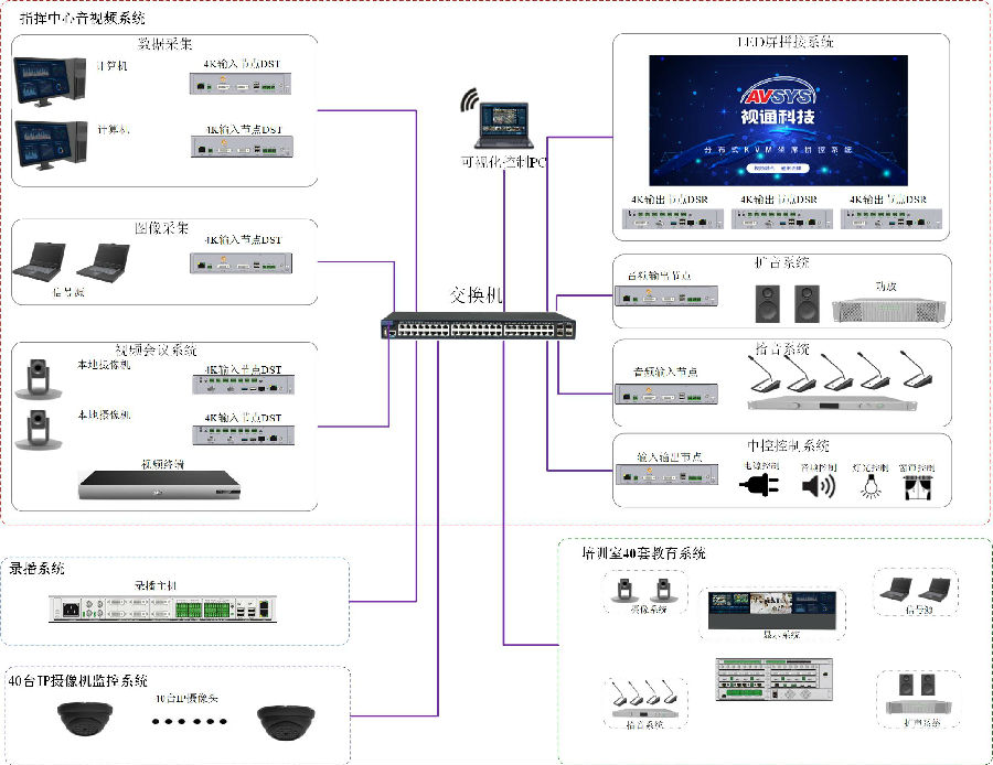 本次为满足河北某部队指挥中心应用,视通科技采用自主研发生产的4K分布式ADS、AVSRTM六合一的高清录播一体机和可视化管控平台,实现指挥中心系统的统一管控、音视频图像调度、会议通讯互动交流和录播等应用。