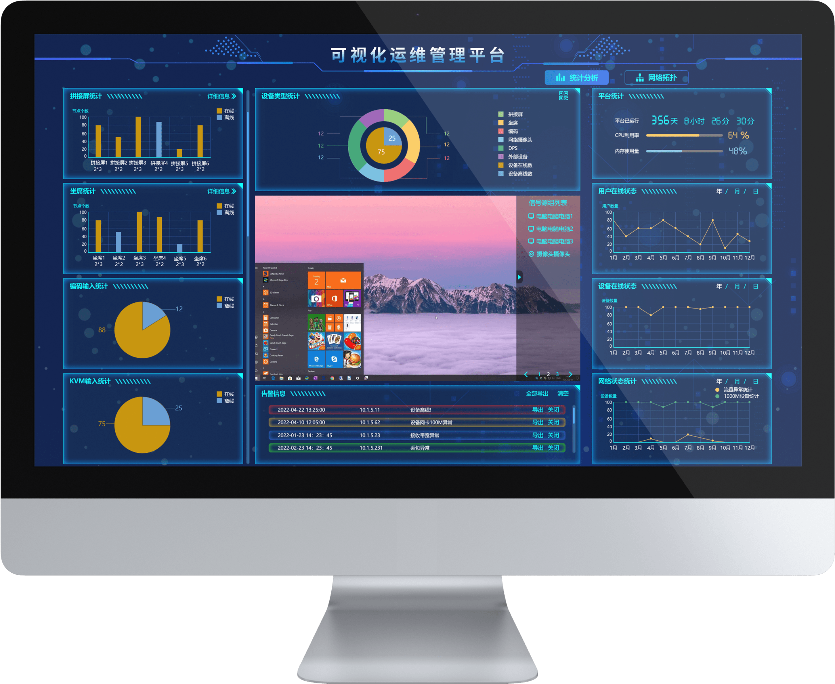 为了解决上述问题,视通科技推出了AS-VMP可视化运维管理平台,该平台主要用于分布式KVM坐席拼控系统在日常运行过程中的状态监控,可以直观的展现系统中对应设备的相关信息,包括设备数量,设备种类以及设备的在线/离线状态。同时能够显示系统的总体运行时间,可以根据时间轴查询过往的用户,设备的在线数量。另外平台还支持信号源预览功能以及告警信息发布功能,可以让现场运维人员直观的了解到信号源是否正常以及快速定位系统中出现的问题。